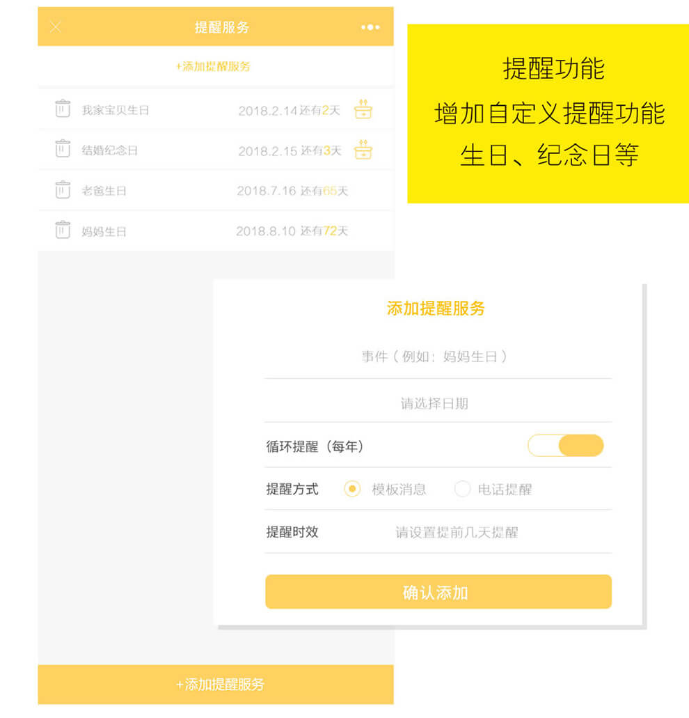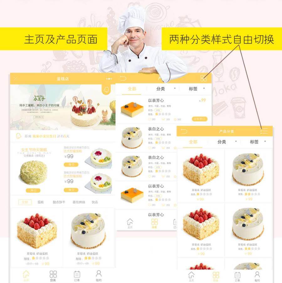 蛋糕订购,购物车,优惠卷,提醒系统,会员中心,商品展示(商品详情,推荐及商品评价),会员卡系统(充值,支付),商家手机处理订单(接单、送货),短信、模版消息,订单动态,订单自动打印,主题切换
